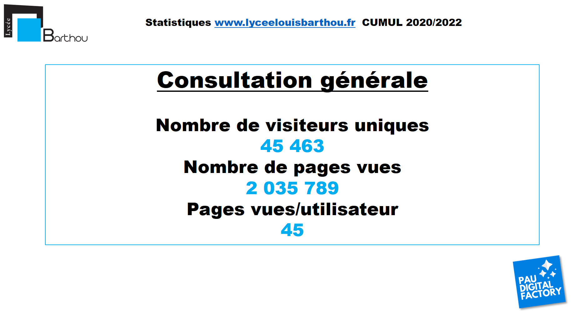 Après 21 mois d'existence, une nouvelle étape est franchie avec plus de deux-millions de vues ! En comptant l'ensemble des jours de l'année, y compris les vacances et les jours fériés, c'est une moyenne de 3.200 vues par jour. En réalité, il existe des variations, avec une consultation plutôt réduite en juillet et août et, inversement, des périodes d'intenses activités, notamment aux moments des choix d'orientation, où les élèves et leurs familles s'informent et découvrent nos formations.