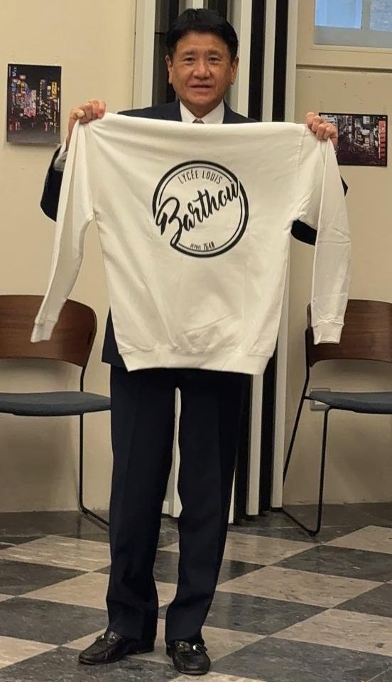 Pendant une heure, Barthou est devenu le lieu de rencontre entre deux pays très éloignés et pourtant qui tendent à se rapprocher l’un de l’autre. Il y a trois ans, le club mangas Barthou (CMB) et l’association MUKU ont relancé le jumelage entre la ville de Pau et la ville de Kofu au Japon, au travers d’un programme d’échange avec le lycée Sundai. Ce programme s’est concrétisé en 2024, par un voyage au Japon et notamment par la visite à la mairie de Kofu avec en point d’orgue, la rencontre avec M. Higuchi, maire de Kofu. Cette visite a marqué un tournant dans la relance du jumelage entre nos deux villes. En effet, M. Higuchi a confié alors au CMB, une lettre adressée au maire de Pau, M. Bayrou, dans laquelle il exprimait le souhait de rendre visite à la ville de Pau dans le cadre des 50 ans du jumelage des deux villes.